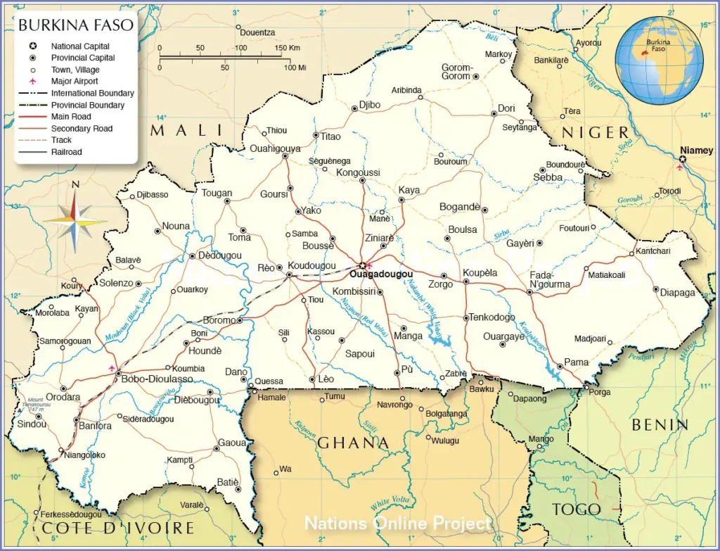 Le Burkina Faso, littéralement « Pays des Hommes intègres », couramment appelé Burkina, ancienne république de Haute-Volta, est un pays d’Afrique de l’Ouest sans accès à la mer. Il est entouré par le Mali au nord-ouest, le Niger au nord-est, le Bénin au sud-est, le Togo au sud-est, le Ghana au sud et la Côte d’Ivoire au sud-ouest.