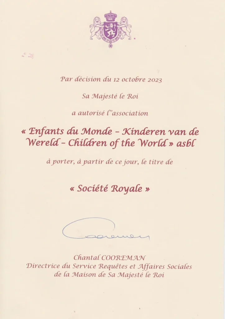 Sa Majesté le Roi Philippe 1er nous a conféré une distinction marquant plus de cinquante années d’existence et d’engagement au service des enfants de pays en développement ! Une belle émotion, car cette reconnaissance témoignait de l’importance et de la solidité de notre association, et soulignait son efficacité et le dévouement de ses membres.