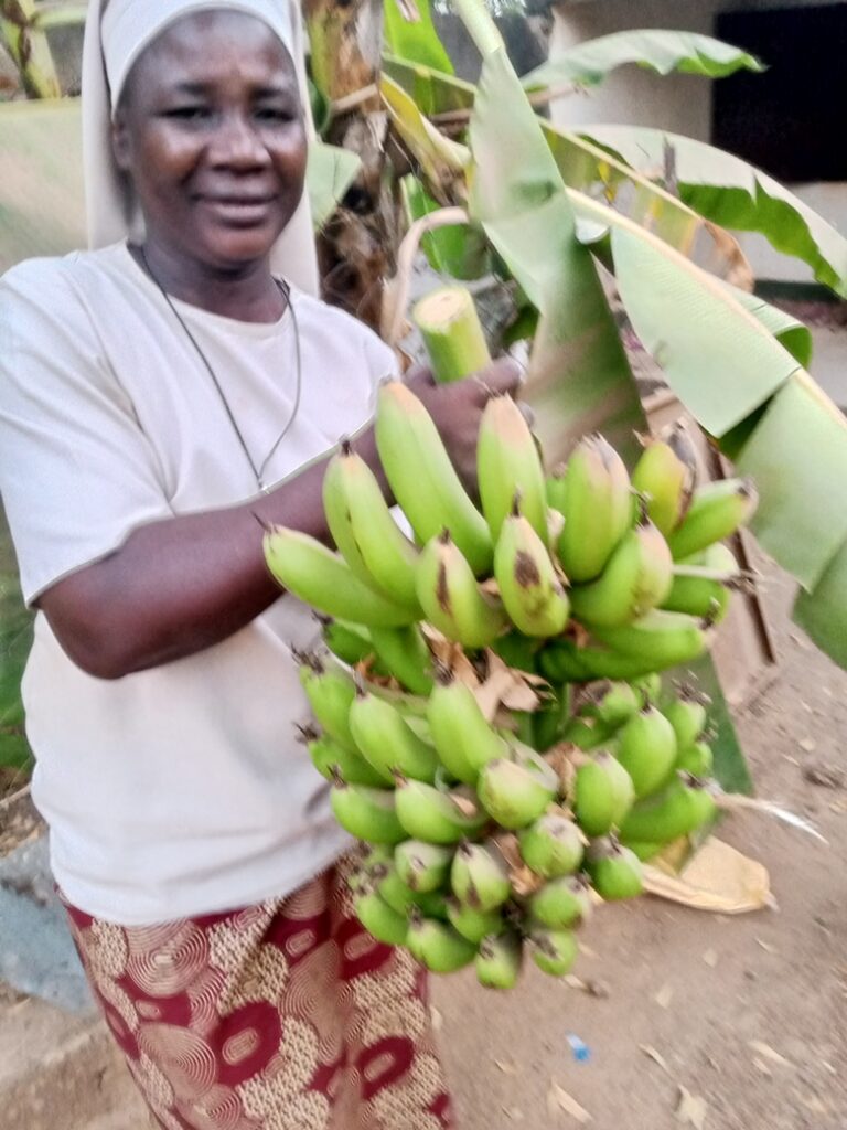Grâce au forage au niveau de l’école maternelle, Sœur Berthe a pu créer un jardin potager pour améliorer en légumes la cantine des filles et des enfants. L’eau du forage sert aussi à entretenir les arbres fruitiers et cela commence à donner des fruits.